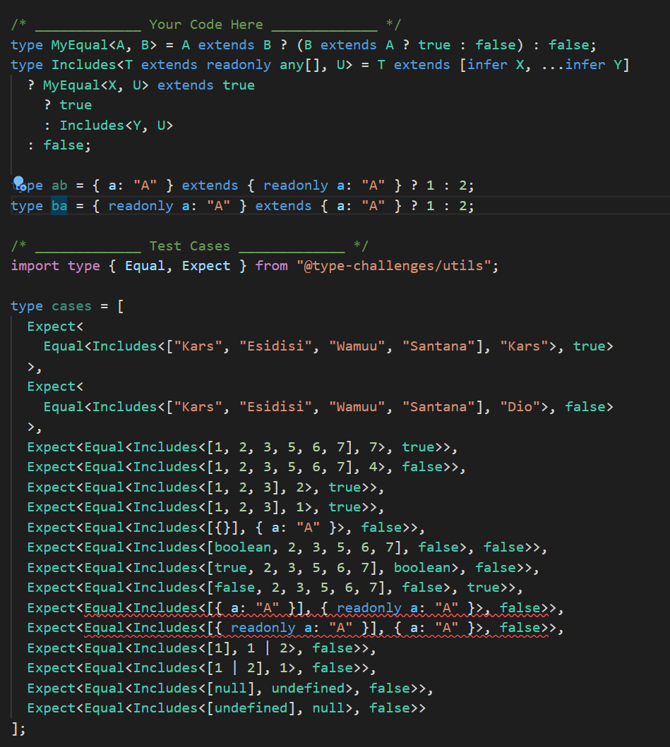 Expect<Equal<Includes<[1, 2, 3, 5, 6, 7], 7>, true>>,