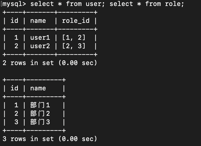 对于下面的表结构,一个用户表,一个角色表,用户表里面的role_id通过JSON格式保存角色id的数组。